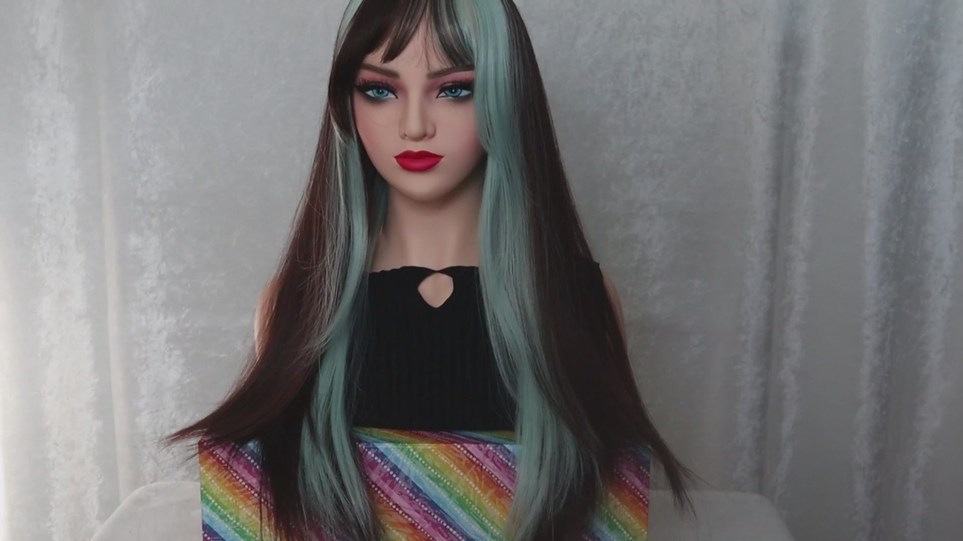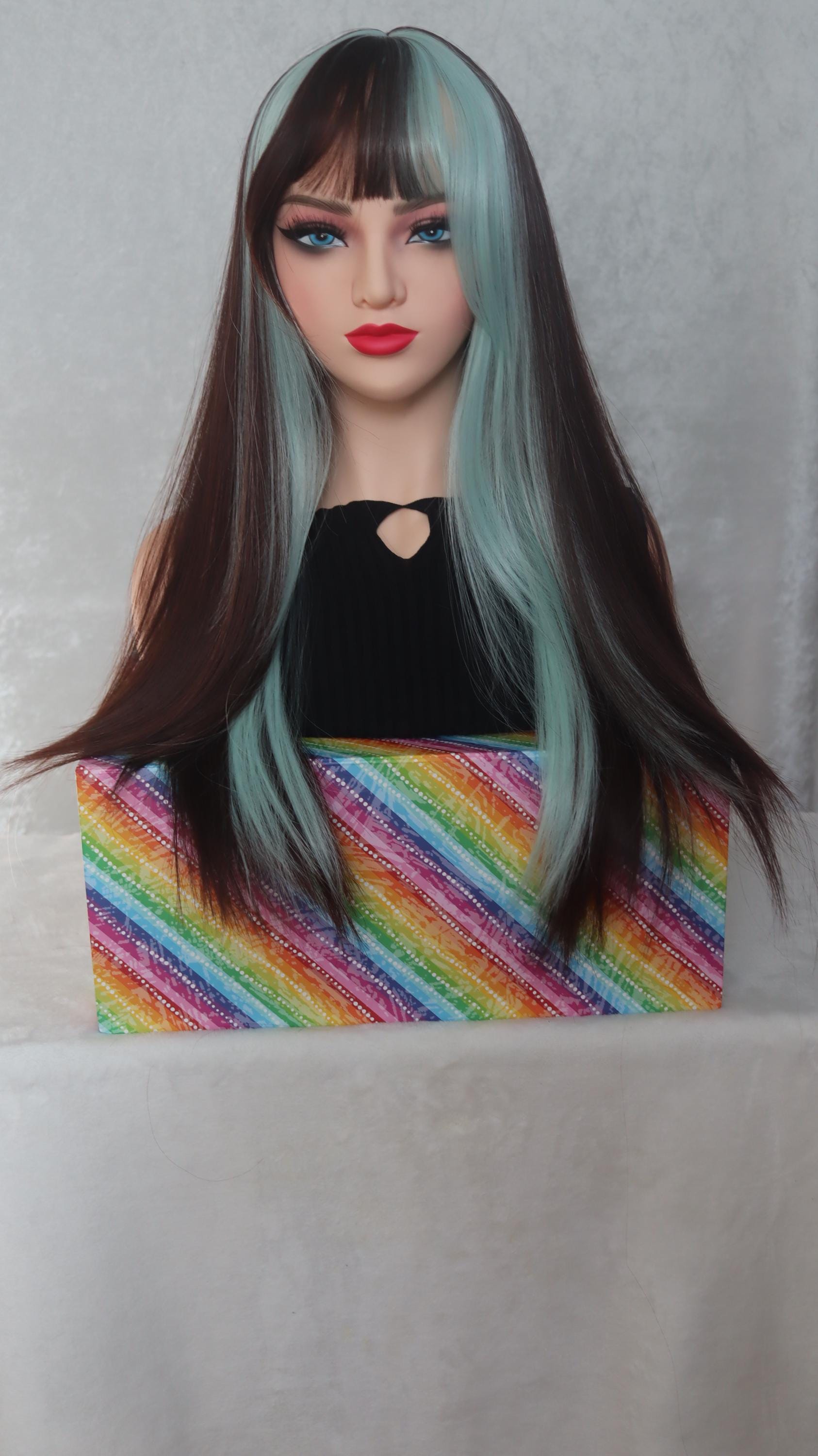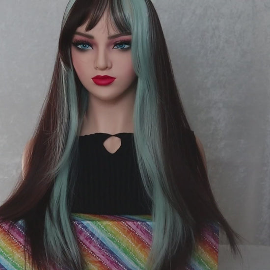 Chocolate Mint Bliss Wig – 26" Straight Brown & Mint Green Stunner with Unique Bangs