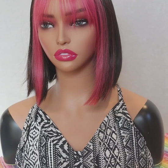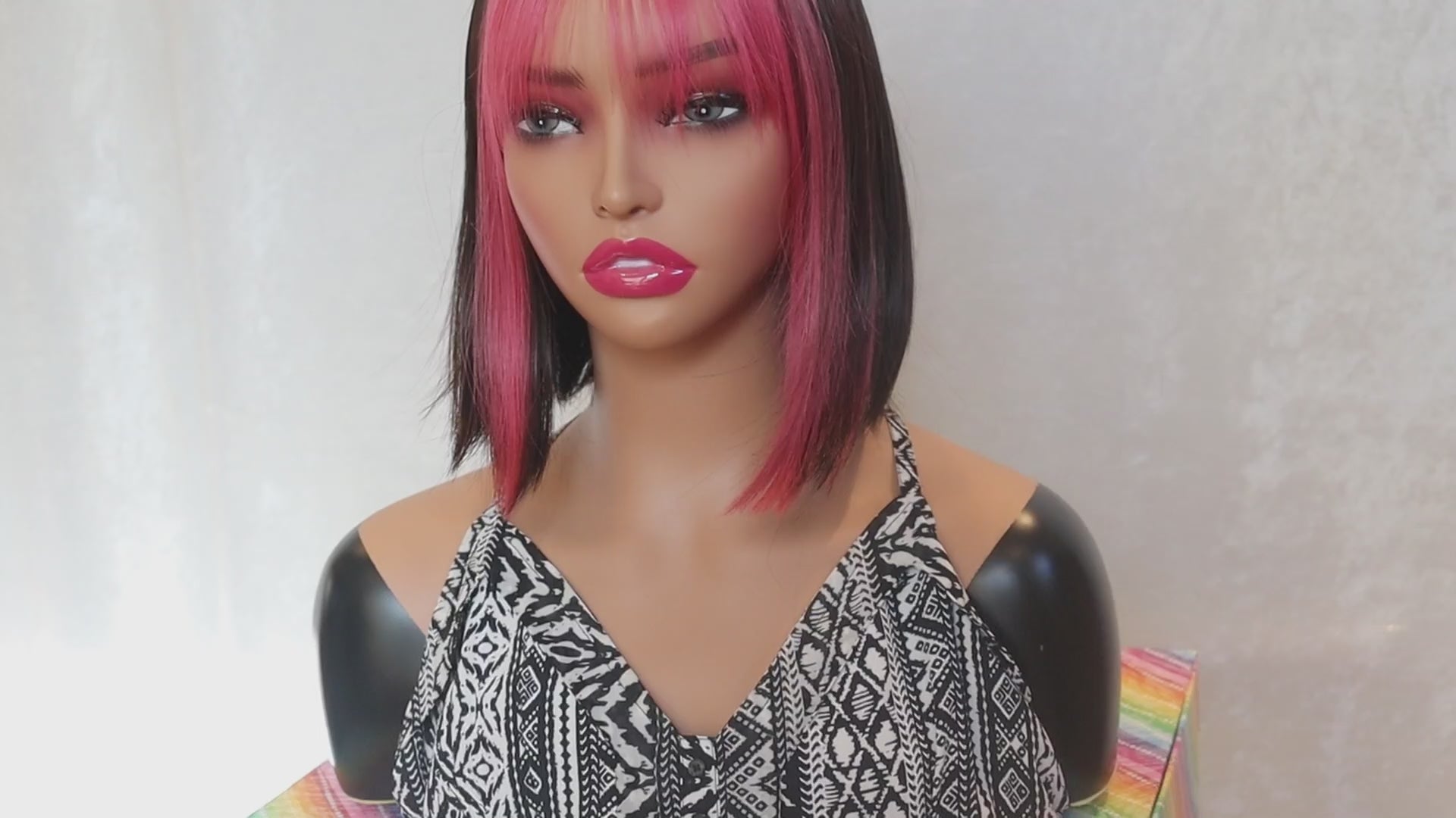 Step into bold elegance with this 12-inch straight bob wig in a rich brown base paired with dark pink fringe and delicate face-framing streaks. This lightweight and breathable wig is designed for comfort and style, perfect for everyday wear or adding a pop of color to your outfit. With its natural skin-top parting and adjustable glueless cap, this wig is a dream for anyone looking for a fuss-free, manageable look.