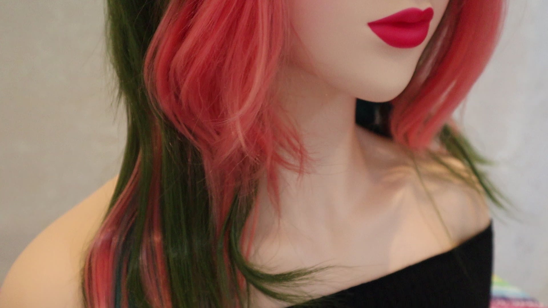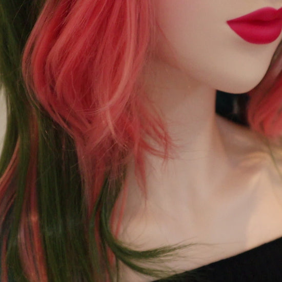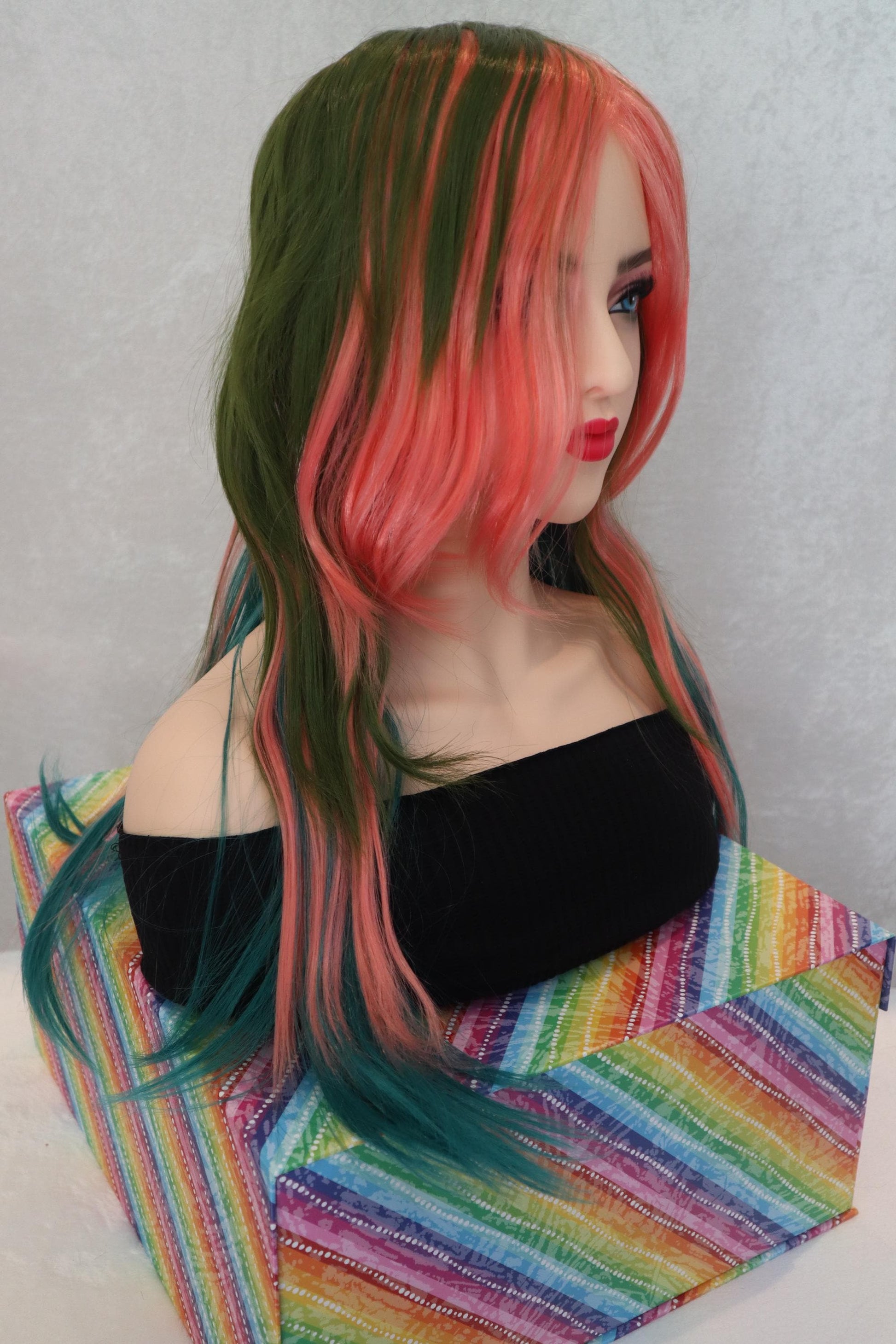 Unleash your inner punk rocker with this eye-catching multi-colored wig! Featuring an edgy blend of green, aqua, and pink, this layered wig is designed for those who aren't afraid to make a statement. The long, side-swept pink bangs perfectly frame the face, adding a touch of emo flair to this rebellious look.